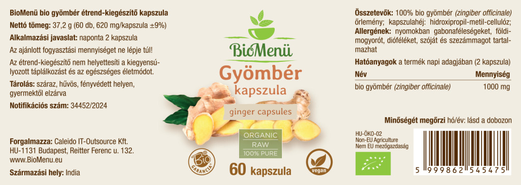 100% organiczny proszek z imbiru lekarskiego (Zingiber officinale); otoczka kapsułki: hydroksypropylometyloceluloza; Alergeny: może zawierać śladowe ilości zbóż, orzeszków ziemnych, orzechów, soi i nasion sezamu