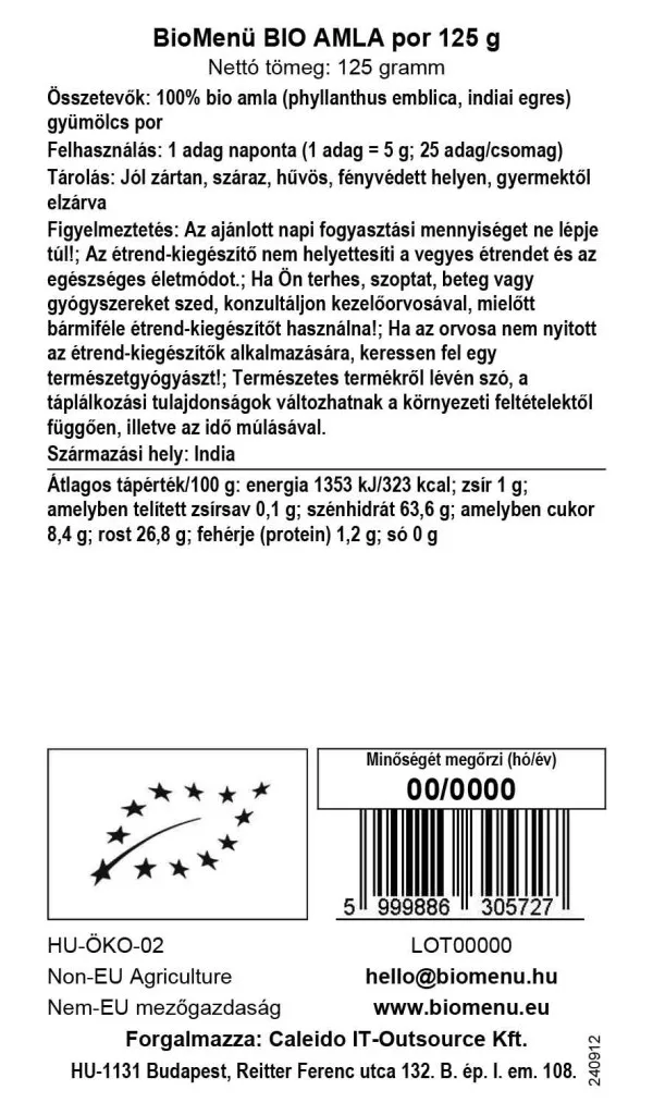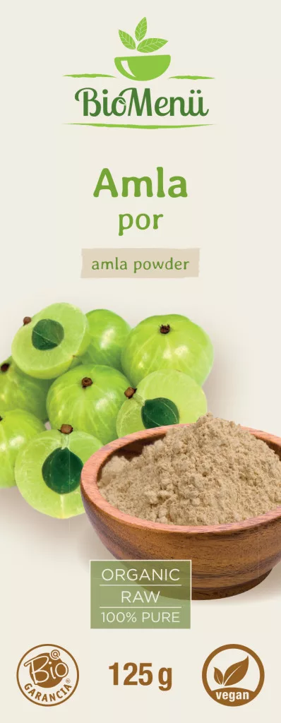 Proszek BioMenu BIO AMLA jest umieszczany w saszetkach po delikatnym, niskotemperaturowym suszeniu i zmieleniu całego owocu. Jest w 100% naturalny, wolny od GMO i nie zawiera żadnych dodatków. Jest niezwykle bogatym źródłem witaminy C i zawiera duże ilości polifenoli, garbników, aminokwasów, przeciwutleniaczy i minerałów. Ze względu na silnie kwaśny smak, spożywa się go w połączeniu z herbatą, napojami owocowymi lub dżemem. Jest również szeroko stosowany w kosmetyce, jako okład na włosy i skórę.