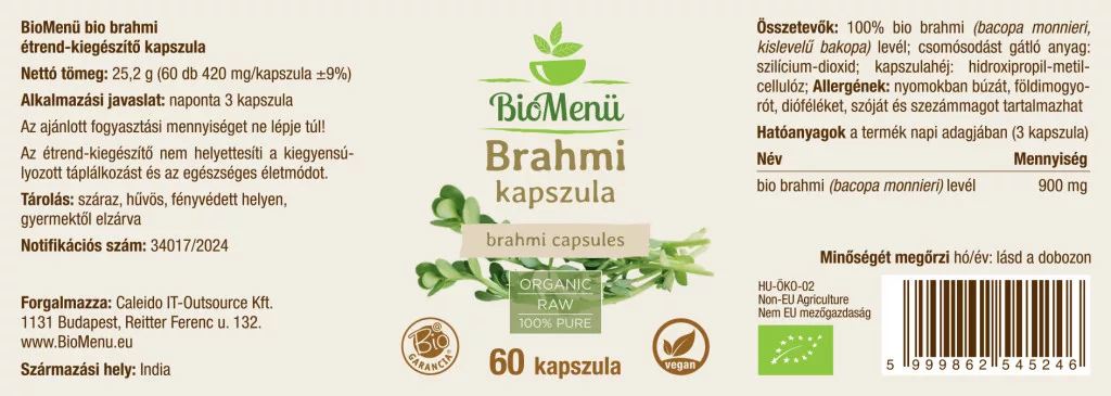 100% organiczne liście brahmi (bakopa drobnolistna, bakopa drobnolistna); substancja przeciwzbrylająca: dwutlenek krzemu; otoczka kapsułki: hydroksypropylometyloceluloza; Alergeny: może zawierać śladowe ilości pszenicy, orzeszków ziemnych, orzechów drzewnych, soi i nasion sezamu