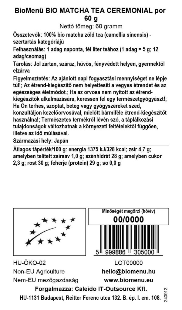 Nasz proszek BioMenu BIO MATCHA TEA CEREMONIAL zawiera zieloną herbatę w proszku o jakości ceremonialnej, która jest używana w tradycyjnych japońskich ceremoniach parzenia herbaty od niemal tysiąclecia. Proszek wytwarzany jest z liści krzewu herbacianego Camellia sinensis. Najdrobniejsze pędy są zbierane i suszone, aby uzyskać drobno zmielony proszek. Ma on unikalny, charakterystycznie gorzki smak. Matcha może być stosowana jako składnik potraw i jako naturalny produkt spożywczy.