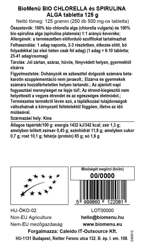 Mieszanka 1:1 100% organicznych alg chlorella (chlorella vulgaris) i 100% organicznych alg spirulina (spirulina platensis); Alergeny: może zawierać naturalnie występujące siarczyny