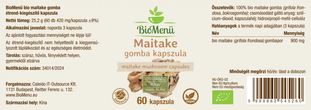 100% organiczny grzyb maitake (żagwica listkowata, pieczarka krzaczasta); substancja przeciwzbrylająca: dwutlenek krzemu; otoczka kapsułki: hydroksypropylometyloceluloza