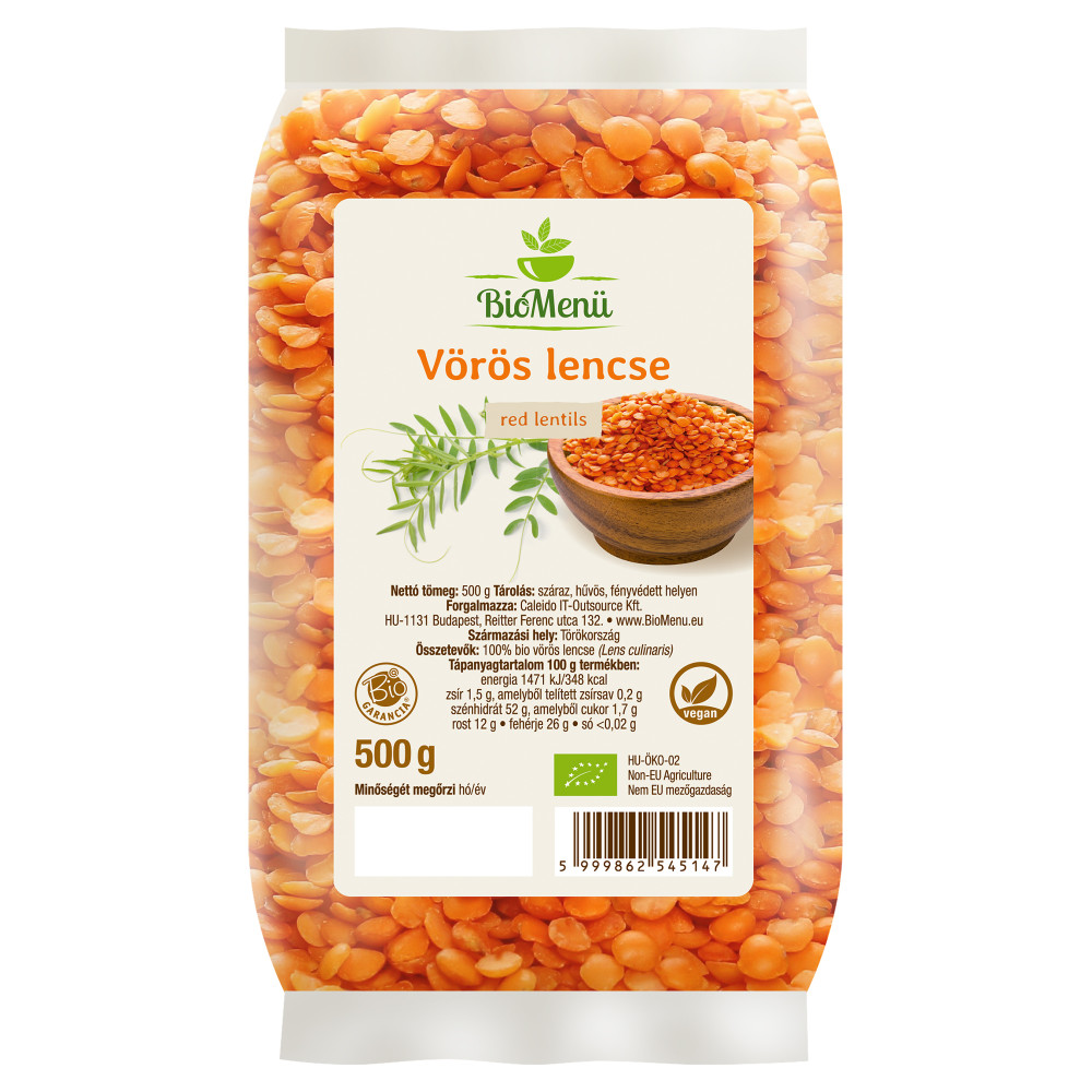 100% ekologiczna czerwona soczewica (Lens culinaris); Alergeny: może zawierać śladowe ilości glutenu i nasion sezamu