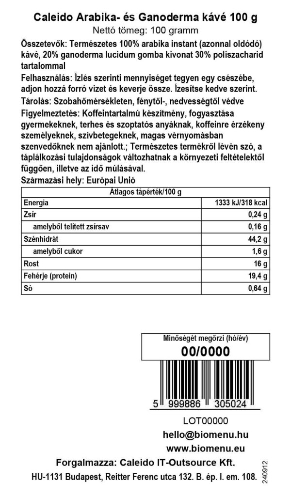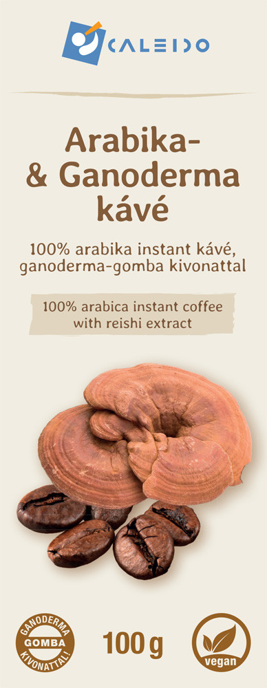 Kawa Caleido Arabica z Ganodermą zawiera w 100% ekologicznie uprawianą kawę rozpuszczalną Fair Trade oraz 20% grzybów Ganoderma lucidum, z 30% zawartością polisacharydów. Charakteryzuje się doskonałym smakiem i pozytywnym wpływem na organizm.
