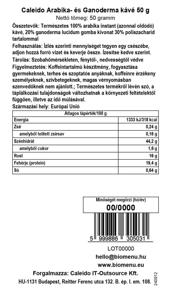 Kawa Caleido Arabica z Ganodermą zawiera w 100% ekologicznie uprawianą kawę rozpuszczalną Fair Trade oraz 20% grzybów Ganoderma lucidum, z 30% zawartością polisacharydów. Charakteryzuje się doskonałym smakiem i pozytywnym wpływem na organizm.
