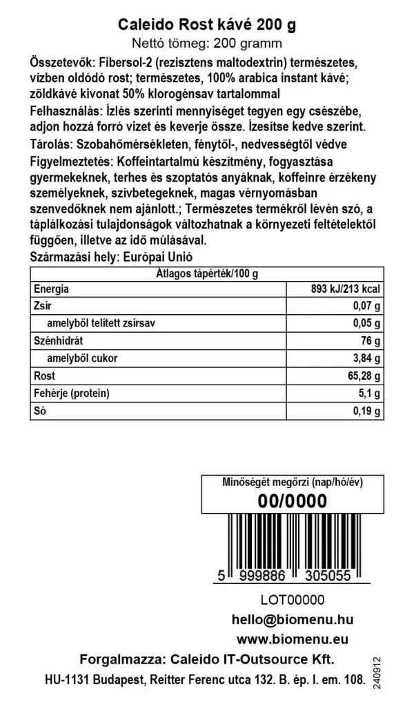 Fibersol-2 (odporna maltodekstryna) naturalny błonnik rozpuszczalny w wodzie; naturalna, rozpuszczalna kawa arabica w 100%; ekstrakt z zielonej kawy z 50% zawartością kwasu chlorogenowego